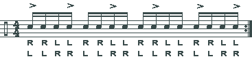 This one has alot of potential for variation; notice the second line is for double bass players - varying the feet. You can also swap the sticking so that the hand mini-pattern starts with a double instead of a single. Lots of different ways to play this!